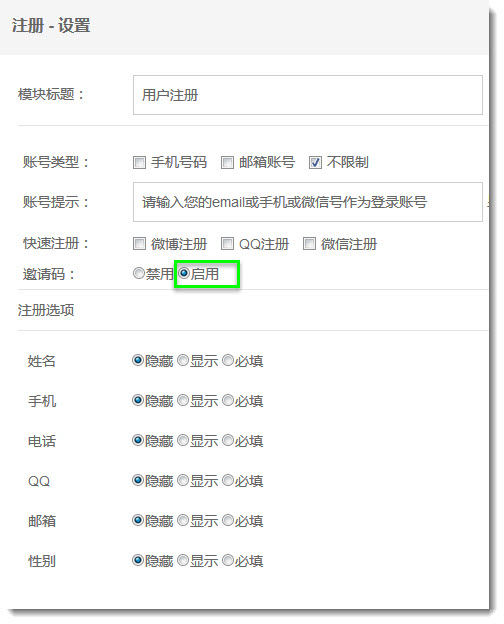 需要注意的是,在使用邀请码注册之前,需要网站管理员选中注册插件,并在设置窗口中勾选,启用邀请码功能。